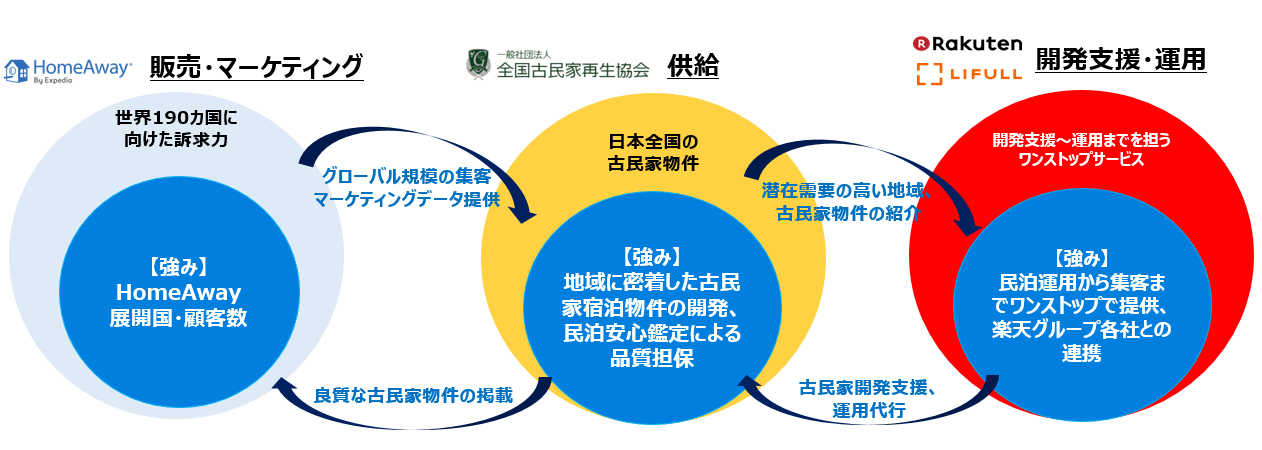 株式会社LIFULLの関連会社である楽天LIFULL STAY株式会社(出資比率:楽天51%、LIFULL49%)、エクスペディアグループで、世界 190 カ国で 200 万件以上のユニークでバラエティーに富む物件を有する、世界最大級のバケーションレンタルサイトのホームアウェイ (本社:米国テキサス州オースティン)、一般社団法人全国古民家再生協会(本社:港区北青山、理事長:園田 正文、以下「全国古民家再生協会」)は、古民家をバケーションレンタルとして活用し、国内外の旅行客に向けて、古民家の認知・価値拡大と地域の観光活性化を加速させることを目的とした業務提携について、本日6月4日に合意しました。