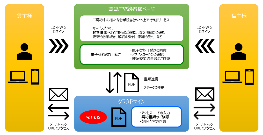 - 貸主、借主が、三井不動産リアルティの運営するホームページ上の「賃貸ご契約者様ページ」でアカウント本登録をします。本人認証が完了した後で、最初に貸主が登録したメールアドレスに「クラウドサイン」から書類の確認依頼メールが届きます。