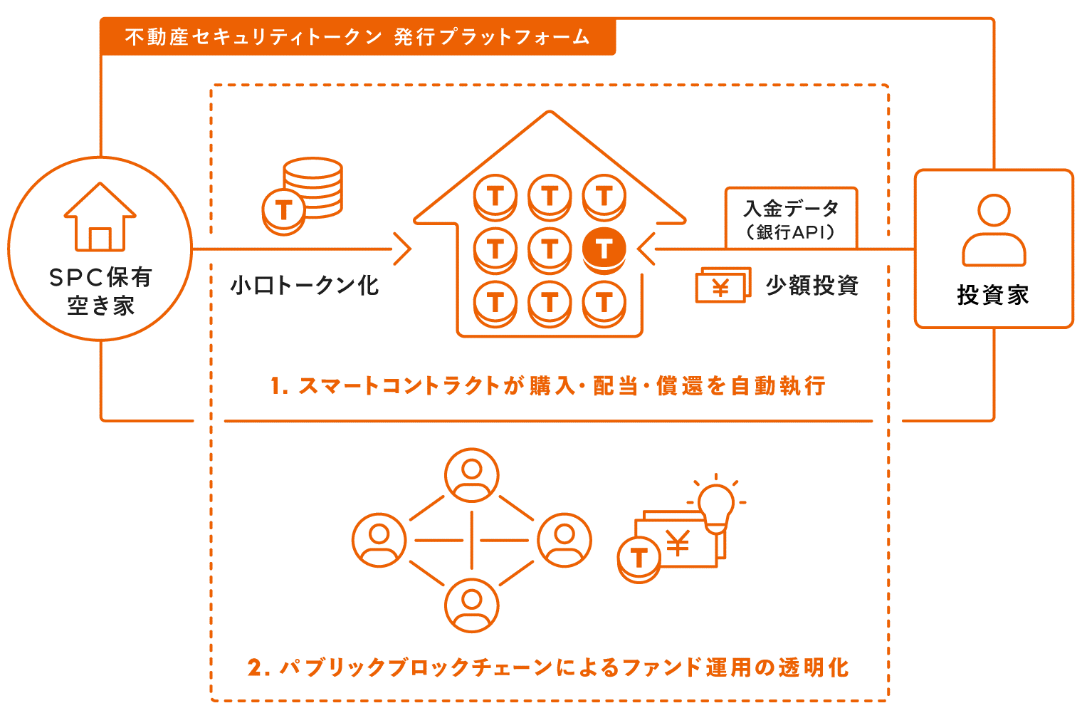 本実証実験では、空き家の地方創生型不動産クラウドファンディングを広く推進する基盤の構築を目的に、ブロックチェーン技術適用による不動産ファンドにおけるオペレーションの自動執行・透明性担保について検証を行いました。