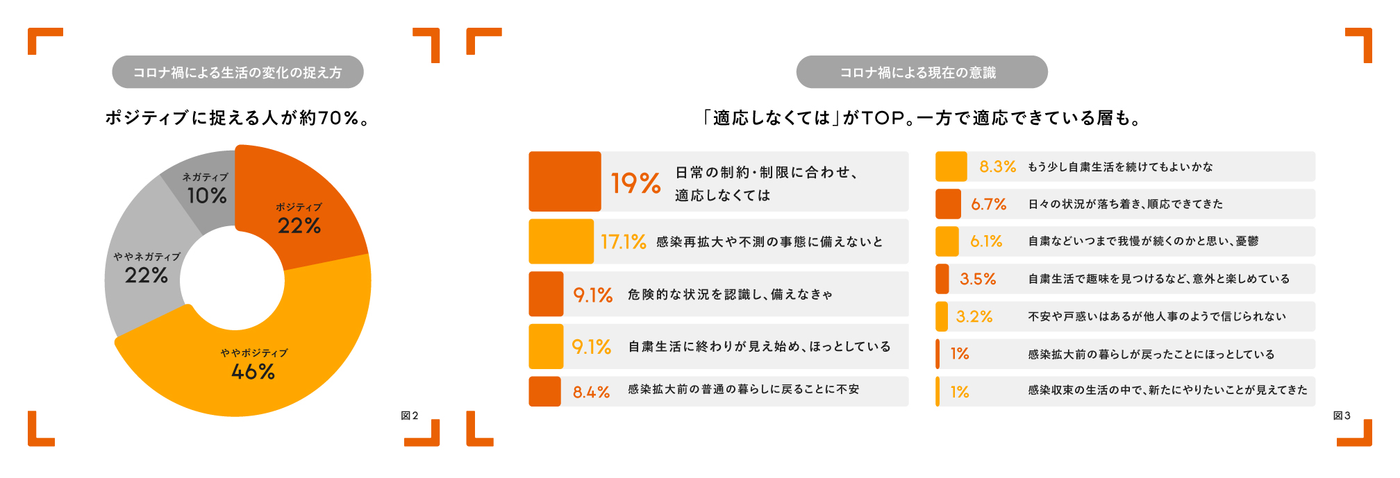 本プロジェクト立ち上げに伴い、独自に実施した調査では、およそ8割の人が新型コロナウイルスの感染拡大によって暮らしに変化が起こったとしながらも、過半数を超える約68%がコロナ禍における様々な生活の変化を総合的に「ポジティブ」「ややポジティブ」と好意的に捉えていることが分かりました。さらに、コロナ禍における現在の意識としては、「日常の制約・制限に合わせ、適応しなくては。と思う」の回答が19.0%と最も多く、ウィズコロナでの新たな生活様式が求められる中、柔軟に変化していこうとする人々の姿勢も伺えました。