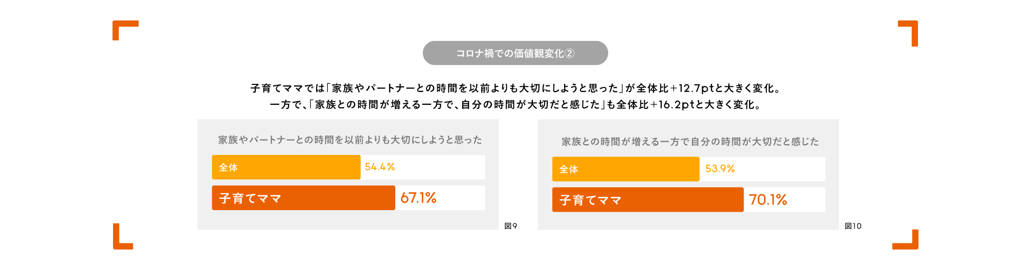 配偶者と子どもがいる女性では「家族やパートナーとの時間を以前よりも大切にしようと思った」と回答した割合が全体比+12.7ptと高い結果となりました。(図9)一方で、「家族との時間が増える一方で、自分の時間が大切だと感じた」が全体比+16.2ptとなり、「子供と一日中一緒でイライラする事が増えた」「食事のメニューで困る」といったように、休校や在宅勤務で家事の回数やそこにかかる時間が増えた結果、負担が増していることも原因の1つと推測されます。(図10)