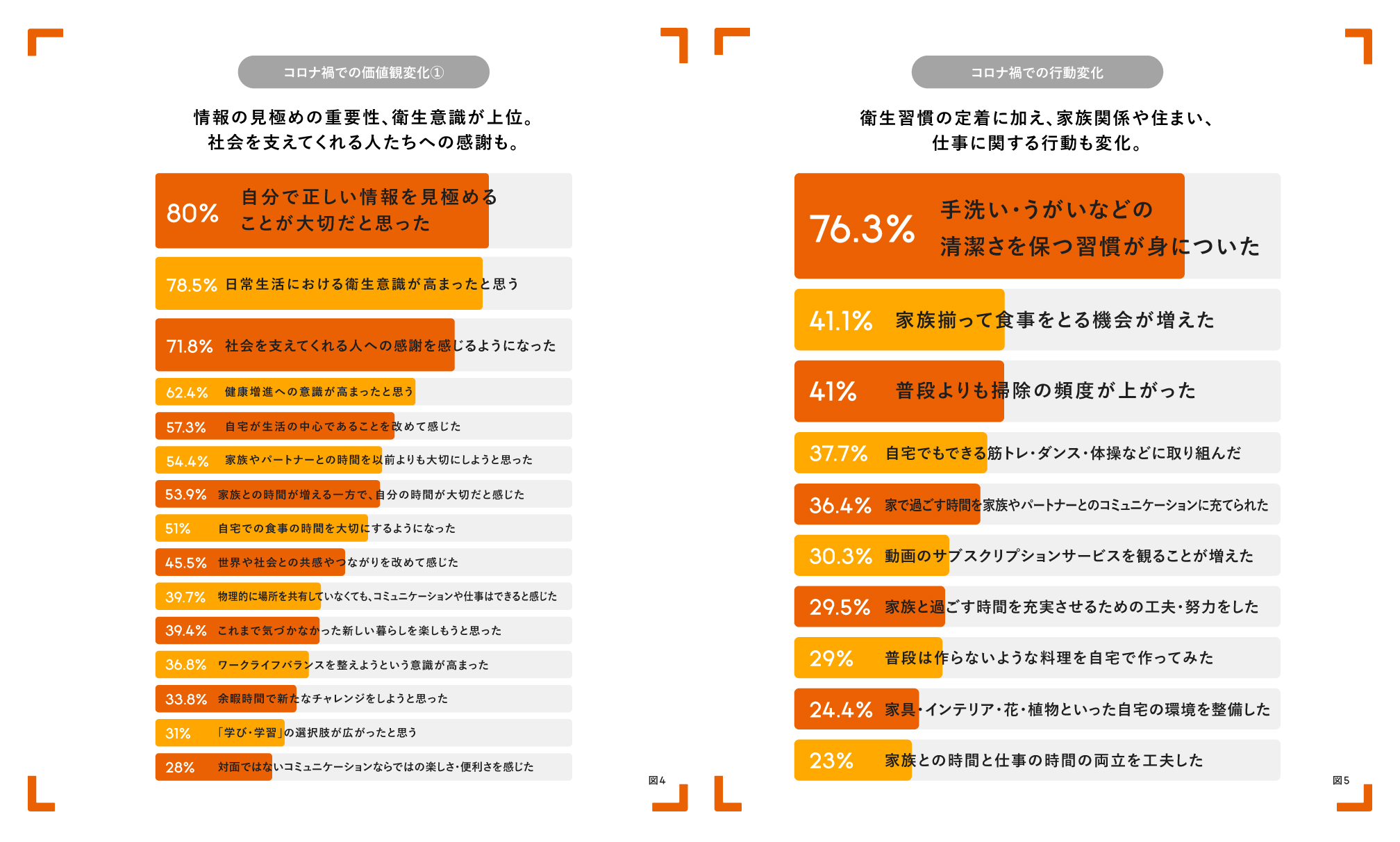 行動変化では「家族揃って食事をとる機会が増えた」(41.1%)「家で過ごす時間を家族やパートナーとのコミュニケーションに充てられた」(36.4%)等、人とのつながりや家族関係の大切さを改めて実感した人もいたようです。(図5)
