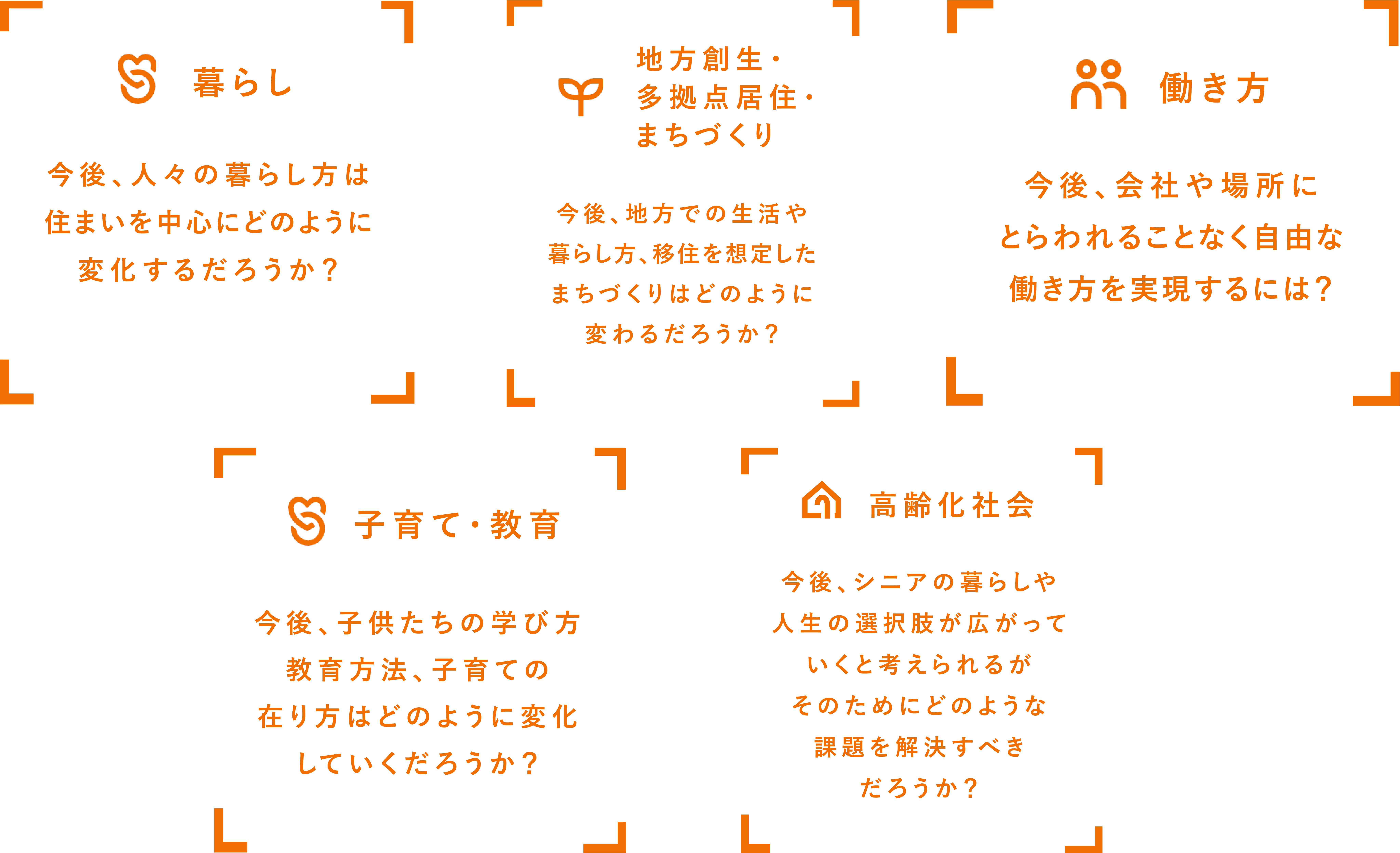LIFULLでは、STAY HOME期間を経て、コロナ禍における生活者の暮らしが変化し始めていることを受け、2020年6月19日から、これからの暮らしを考えるプロジェクト「話そう、これからの暮らし。-From MY HOME-」を開始しました。そして、このプロジェクトを通じて寄せられた様々な声を元に「これからの暮らし」のなかで重要であると考えた5項目を募集テーマに選びました。
