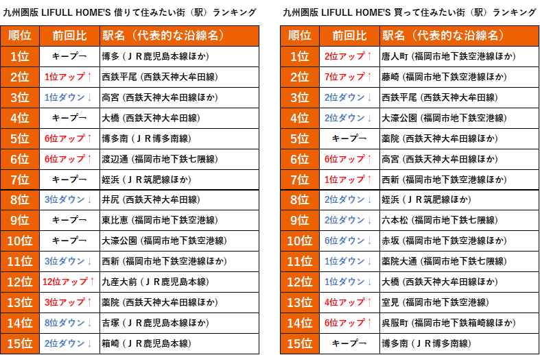 賃貸は「博多」が4年連続の1位、購入では前回3位の「唐人町」が初の1位を獲得。