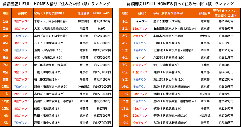 1位の「本厚木」を筆頭に「千葉」「柏」「町田」などがランキング上位に登場し、準近郊・郊外でも都心方面へ乗換なしでアクセス可能な路線沿いの駅に多くの人が関心を寄せるという”郊外化”の傾向が鮮明になりました。