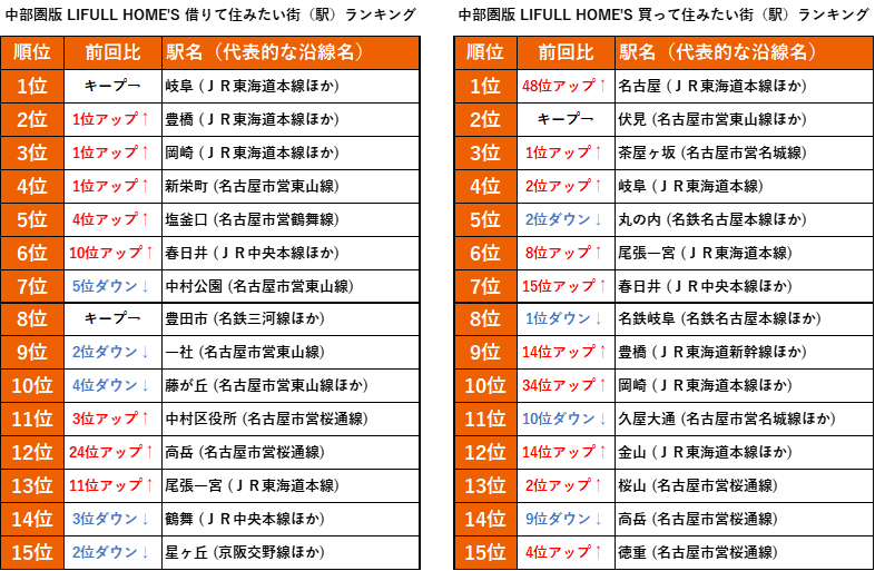ただし、前回16位から6位へとベスト10入りした「春日井」をはじめ、13位の「尾張一宮」、19位の「穂積」など名古屋市郊外の駅が上位に登場し始めており、僅かながら賃貸ユーザーの郊外化が発生している可能性を見ることもできます。