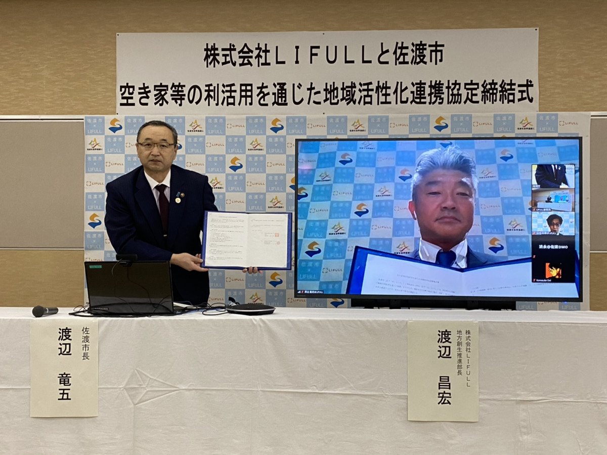 株式会社LIFULL(本社:東京都千代田区、代表取締役社長:井上 高志、以下「LIFULL」)と新潟県佐渡市(市長:渡辺 竜五、以下「佐渡市」)は、本日2021年3月25日(木)に佐渡市の地域経済の活性化を目的に、空き家等の利活用等を通じた地域活性化連携協定(以下「本協定」)を締結いたしました。