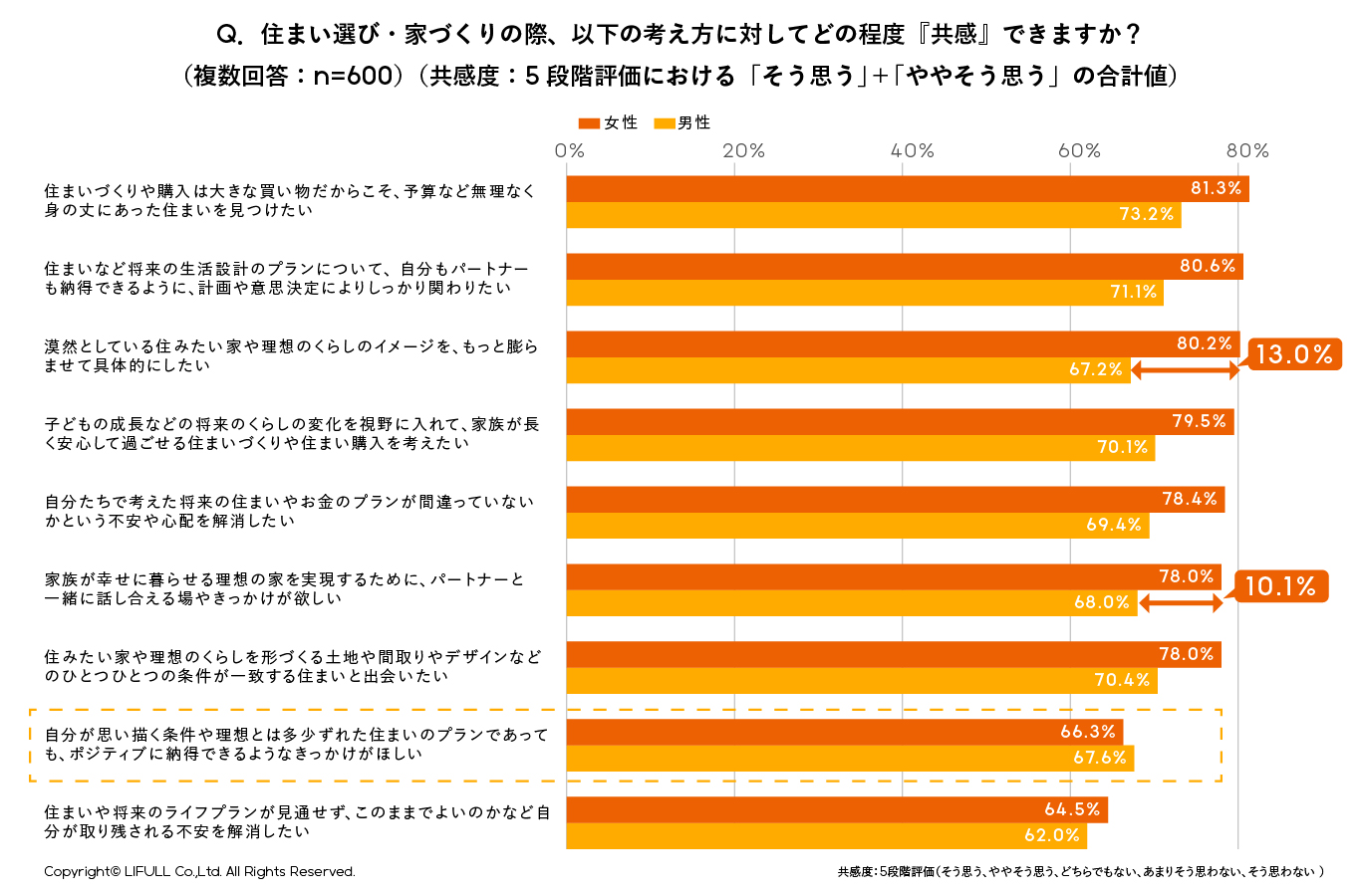 また、女性と男性で乖離が大きかったのは「漠然としている住みたい家や理想のくらしのイメージを、もっと膨らませて具体的にしたい」(男性:67%、女性:80%)、「家族が幸せに暮らせる理想の家を実現するために、パートナーと一緒に話し合える場やきっかけが欲しい」(男性:68%、女性:78%)となり、女性は夫ともっと対話をした上で理想の家づくりを実現させていきたいと考えていることがうかがえました。