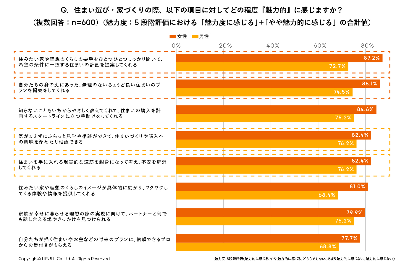 女性は「住みたい家や理想のくらしの要望をひとつひとつしっかり聞いて、希望の条件に一致する住まいの計画を提案してくれる」(87%)、「自分たちの身の丈にあった、無理のないちょうど良い住まいのプランを提案してくれる」(86%)が上位となり、無理のない範囲で理想を追求したいという想いが見えました。一方で、男性は「気構えずにふらっと見学や相談ができて、住まいづくりや購入への興味を深めたり相談できる」「住まいを手に入れる現実的な道筋を親身になって考え、不安を解消してくれる」(いずれも76%が)1位となり、マイホーム購入への不安を抱いている人や、まだ漠然としたイメージしか抱けていない人も多いのではないかと推察されます。