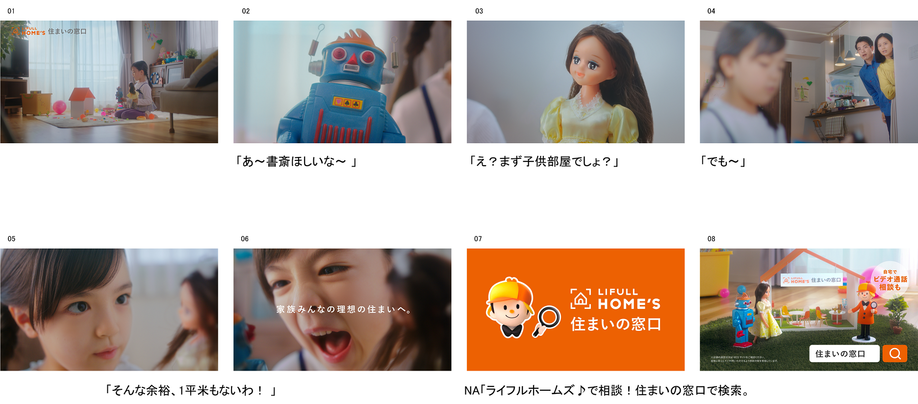 本CMは「自分の書斎が欲しい」パパと、「まず子ども部屋!そんな余裕、一平米もない!」と反応するママとの家づくりの会話を女の子がぬいぐるみを使って真似をするシーンから始まります。そこに家族みんなの理想とする住まい探しを手助けするホームズくんが登場。家づくりの悩みを解決して、理想の住まいを叶える第一歩としてLIFULL HOME'S 住まいの窓口の相談カウンターへご案内します。家づくりで悩んでいる夫婦の「理想とする住まいのズレ」をお人形遊びで表現する可愛らしい子役の演技に注目ください。