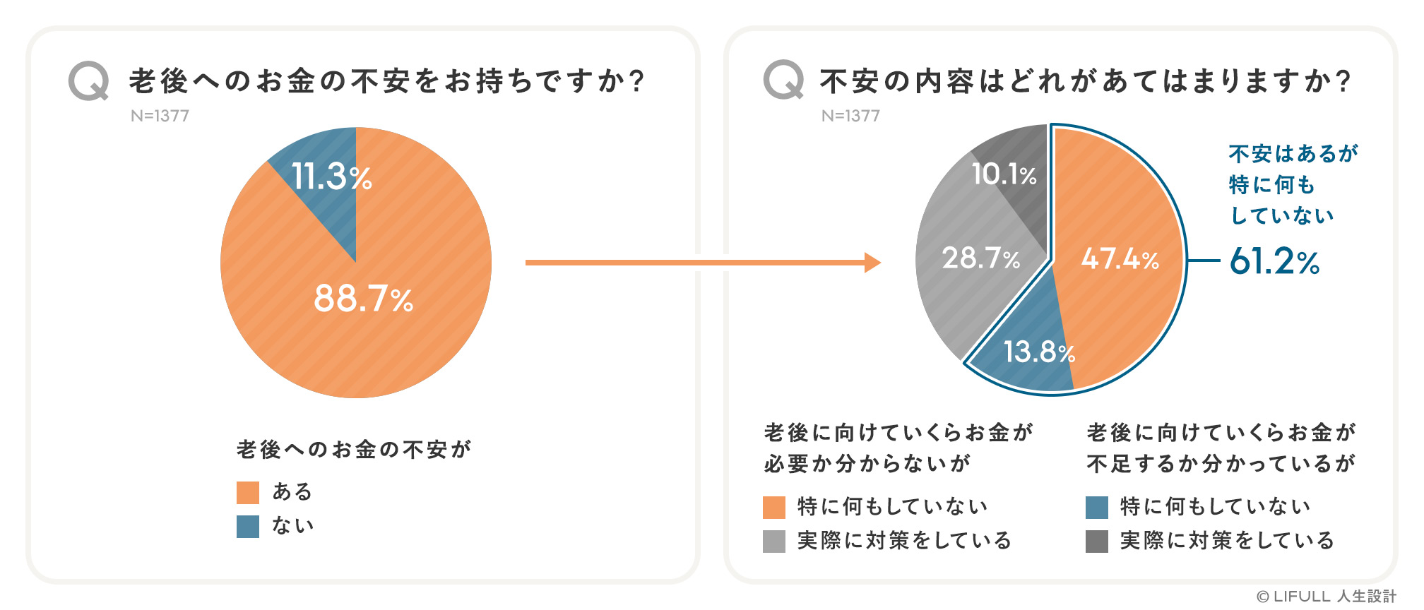 人生100年時代に向けて、より自分らしく生きるための人生設計が望まれるものの、LIFULL調査によると(※1)、40歳~65歳の88.7%が老後へのお金の不安を抱えており、このうち61.2%は不安に対して特に何も対策していないという結果でした(下図)。