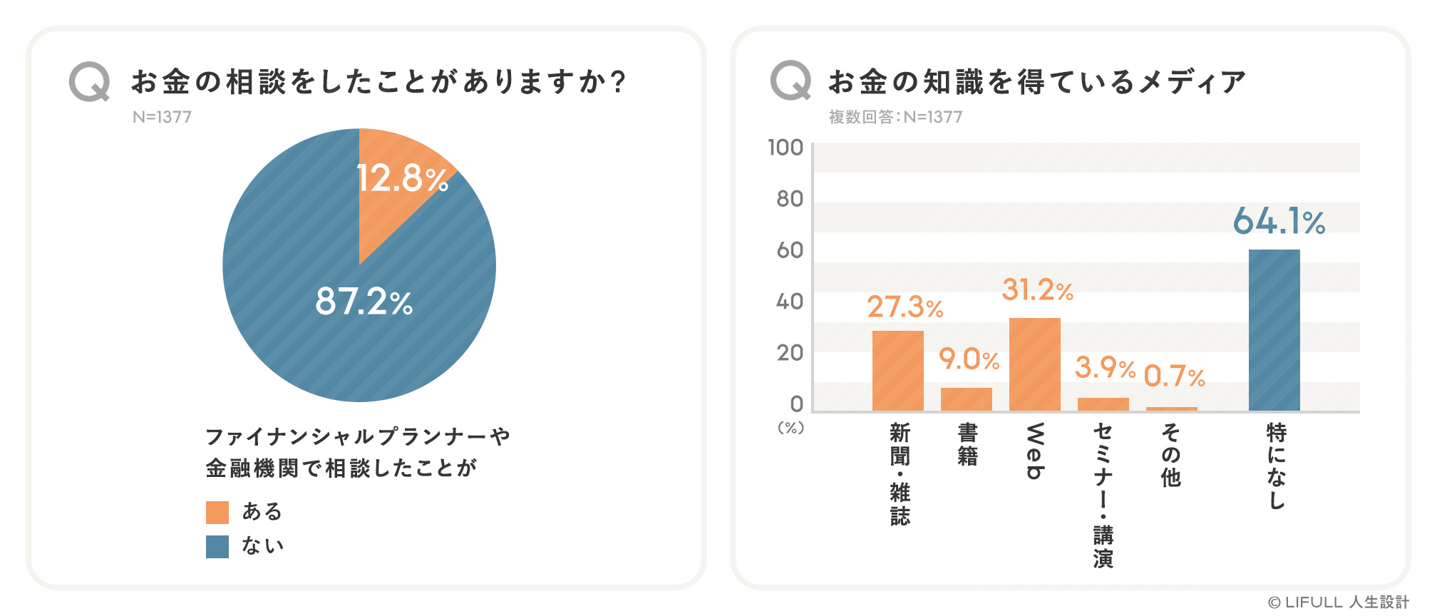 また、40歳~65歳の87.2%が金融機関やファイナンシャルプランナーなどに相談したことがなく、同64.1%が「お金の知識を得ているメディア」は特にない、という結果でした(下図)。