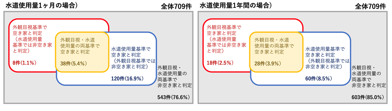 今回、分析利用住所数の「水道情報」の709件に対して、水道使用量に基づく空き家判定を実施しました。