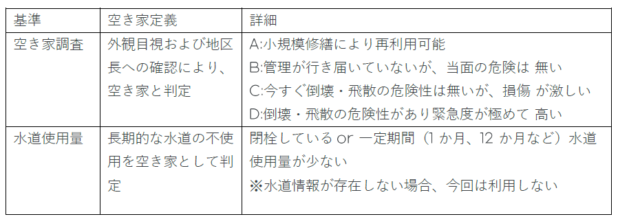 空き家と定義するには、当該建築物等を現に意図をもって用いていないものであり、一般的な空き家調査に基づき、外観目視および行政区長・隣接居住者への確認によって空き家と判定する。今回は、長期的な水道の不使用を空き家として判定し、空き家調査によって空き家と特定された情報と突合し、実際に空き家であったかの確認を行いました。