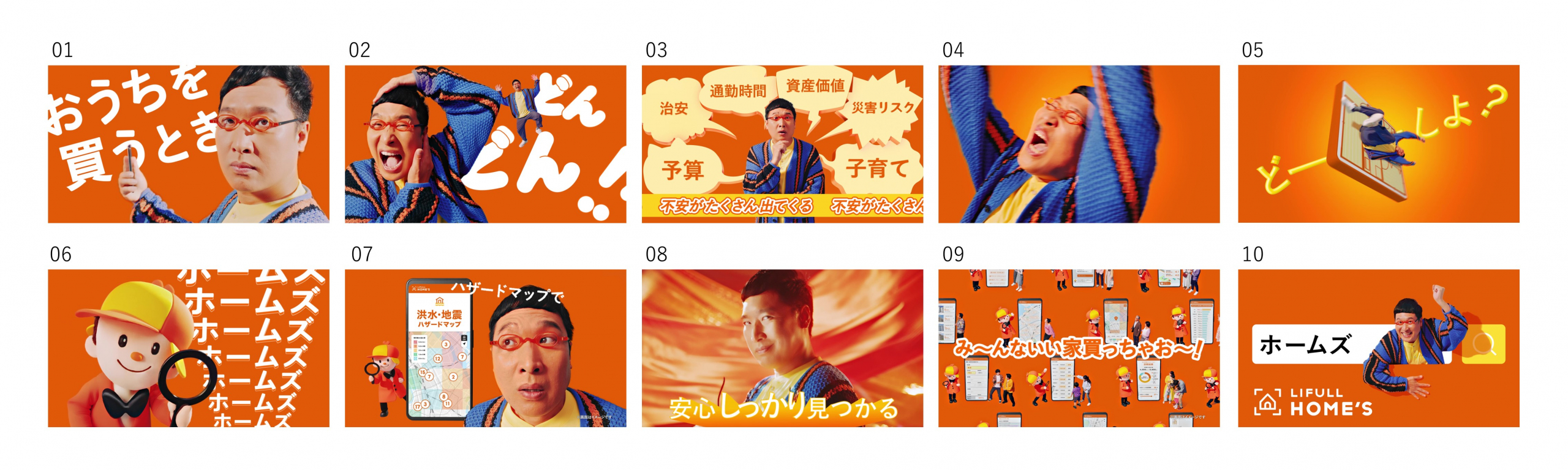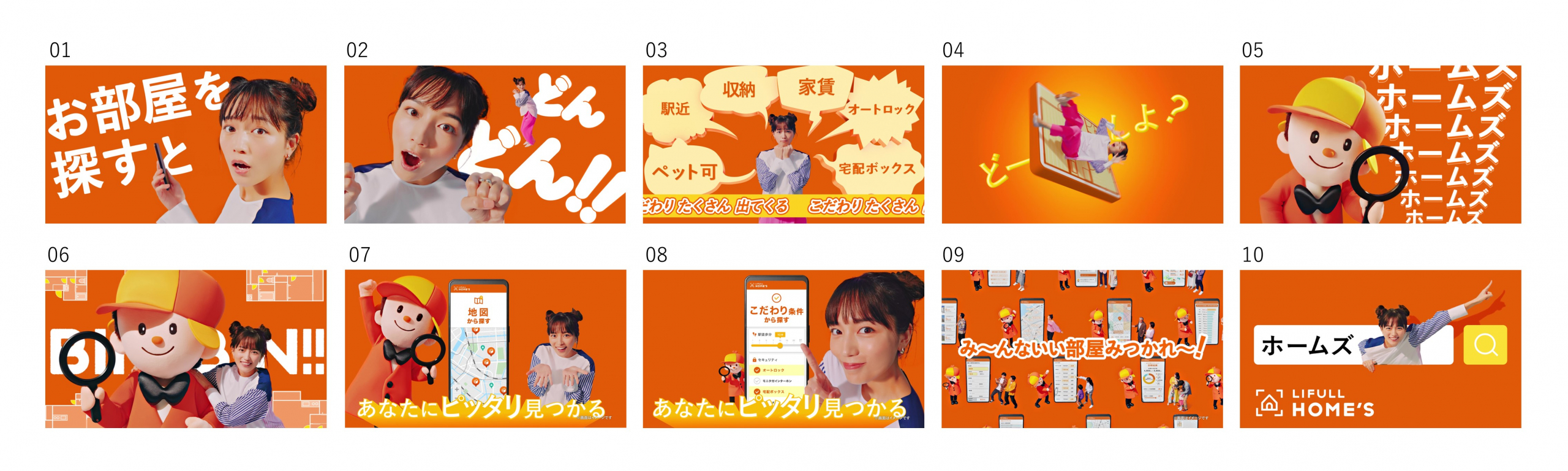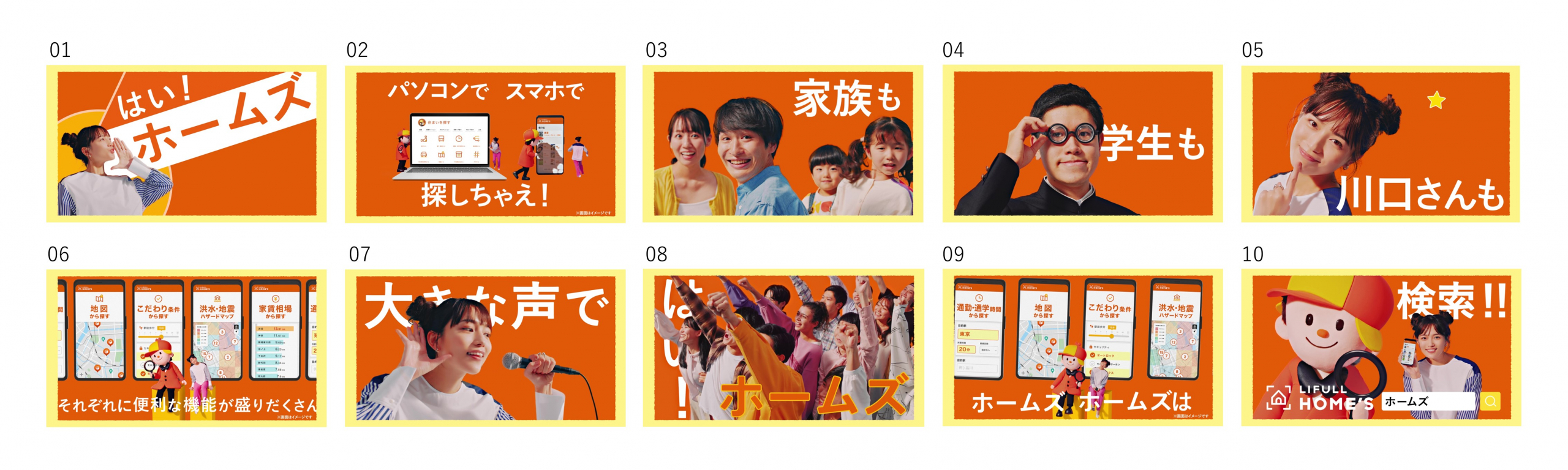 「はい!ホームズ!」と大きな声で叫ぶ、川口さんの登場から始まり、「おジャ魔女カーニバル!!」のサビに合わせて、豊富な「LIFULL HOME'S」の検索機能を川口さんとホームズくんが、一人ひとりに紹介していきます。