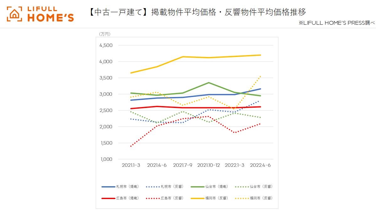 2022年4月~6月期の掲載物件平均価格は、仙台市が2,948万5,287円で同99.5%、広島市が2,609万9,266円で同99.7%とほぼ横ばい傾向ですが、札幌市は3,156万5,437円で同109.6%、福岡市は4,193万521円で同109.4%と高い上昇率となりました。