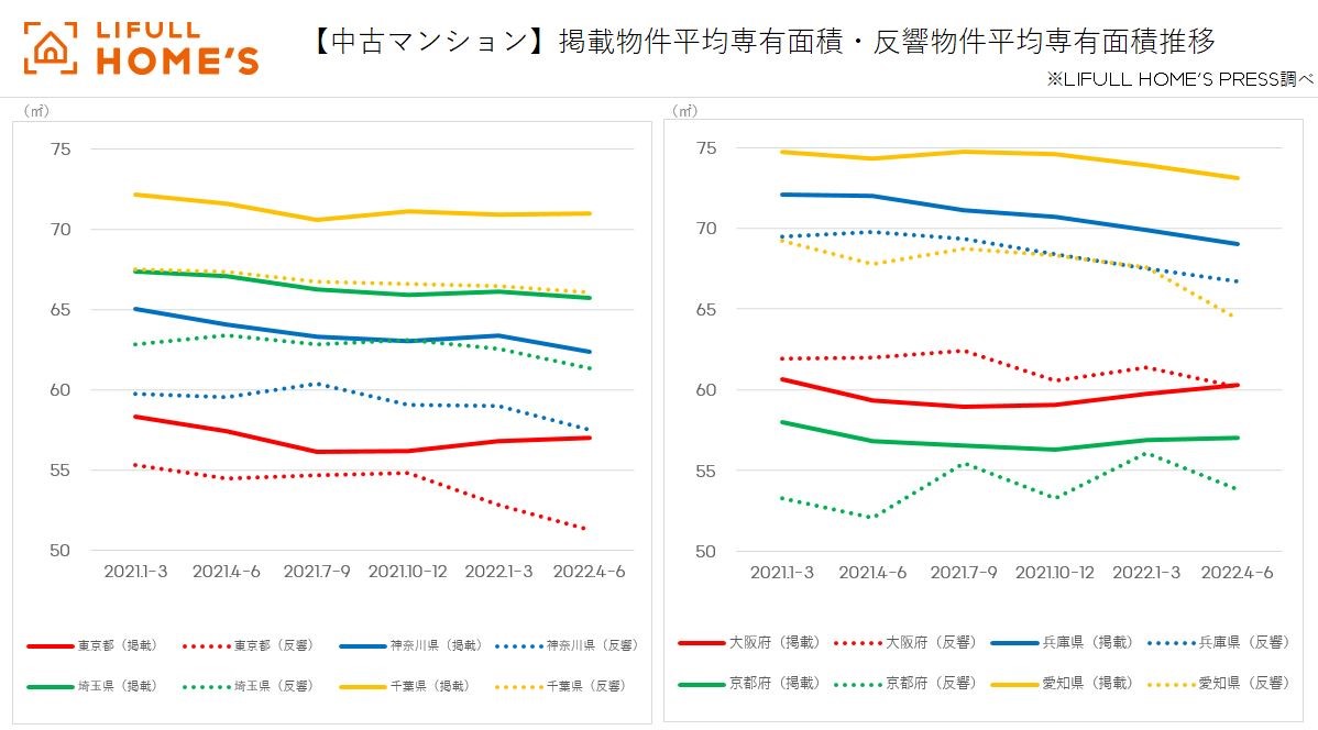 中古マンションの2022年4月~6月における反響物件平均専有面積は、首都圏1都3県・近畿圏2府1県・愛知県および札仙広福(※5)のすべてで前期(1~3月)と比べて縮小しています。掲載物件平均価格が上昇するなか、ユーザーは希望する専有面積を小さくしてでも、価格を抑えた物件を求めている可能性があります。