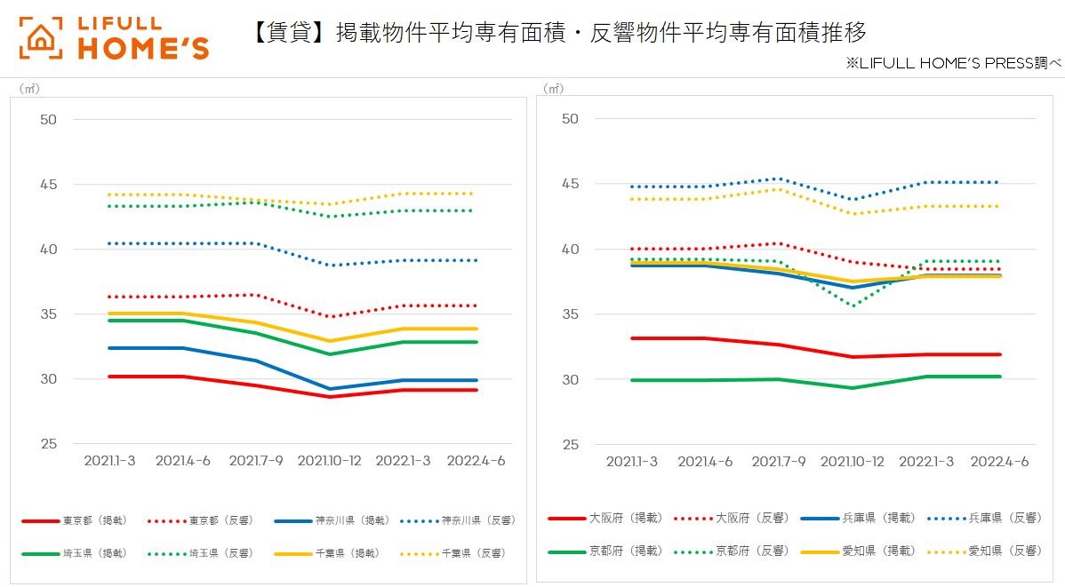 賃貸物件の2022年4~6月における掲載物件平均専有面積は、東京都が29.13㎡で前期比101.9% 前年比96.5%、神奈川県が29.87㎡前期比102.2% 前年比92.2%、埼玉県が32.84㎡で前期比102.9% 前年比95.2%、千葉県が33.85㎡で前期比102.9% 前年比96.6%と、首都圏では前年と比べると縮小傾向にありますが、いずれも前の3ヶ月からは拡大に転じました。