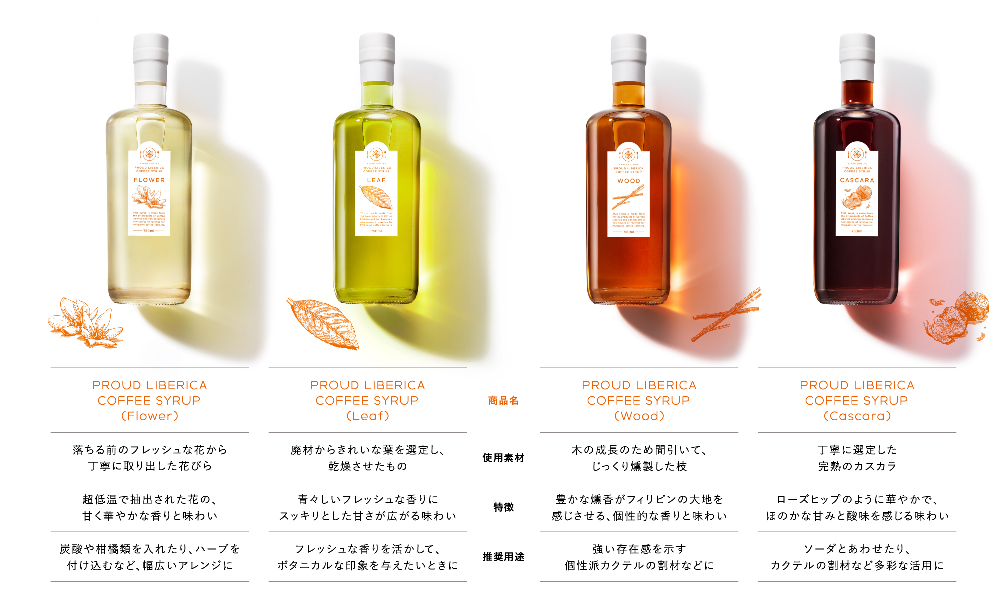 コーヒー農家は、コーヒー生豆を売ることで生計を立てていますが、収穫の機会は限られており、病害や気候変動などの影響も受けることから、収入は不安定になりがちです。そこで、通常は堆肥か廃棄になる花、葉、枝、カスカラを原材料に「コーヒーノキを丸ごと味わうシロップ」を開発できれば、農家の収入の安定に繋がるのではないかと考えました。4種の個性溢れるシロップを楽しむのと同時に、コーヒー農家やリベリカ種に想いを馳せていただけると嬉しく思います。