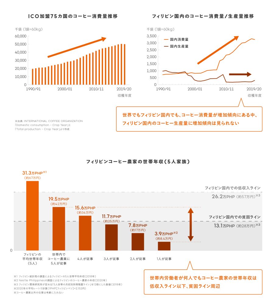 コーヒーは世界中で愛されており、ICO(国際コーヒー機関)の調査では、世界のコーヒー消費量は年々増加、コーヒー生産国のひとつであるフィリピンでもその消費量は増加傾向にあります。しかし、歴史的には1889年のさび病蔓延や輸出競争の激化、現代では2,000店を超える外資コーヒーチェーンの進出などにより、フィリピン国内のコーヒー生産量は減少の一途をたどっています。コーヒーを栽培して生豆を売るだけでは生活が成り立たず、コーヒー農家の慢性的な貧困につながる問題となっています。