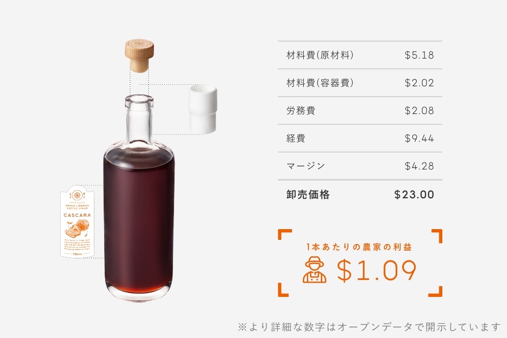 コーヒー農家が無理や我慢をしいられることなくサステナブルなコーヒーノキの栽培やシロップ生産を実現するために、PROUD LIBERICA COFFEE SYRUPの原材料や産地だけでなく、原料となる廃材の買取価格や製造・開発・流通のコスト、マージン、農家の利益などバリューチェーン上のすべての数字を開示しています。