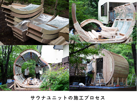 プロジェクトの第一弾として、出資先として関わるVUILD株式会社(本社:神奈川県川崎市、代表取締役:秋吉浩気、以下VUILD)と共同で、デジタル木材加工技術を用いた組み立て式のサウナユニットを開発し、プライベートサウナ付き貸別荘として2022年10月25日より運営を開始します。