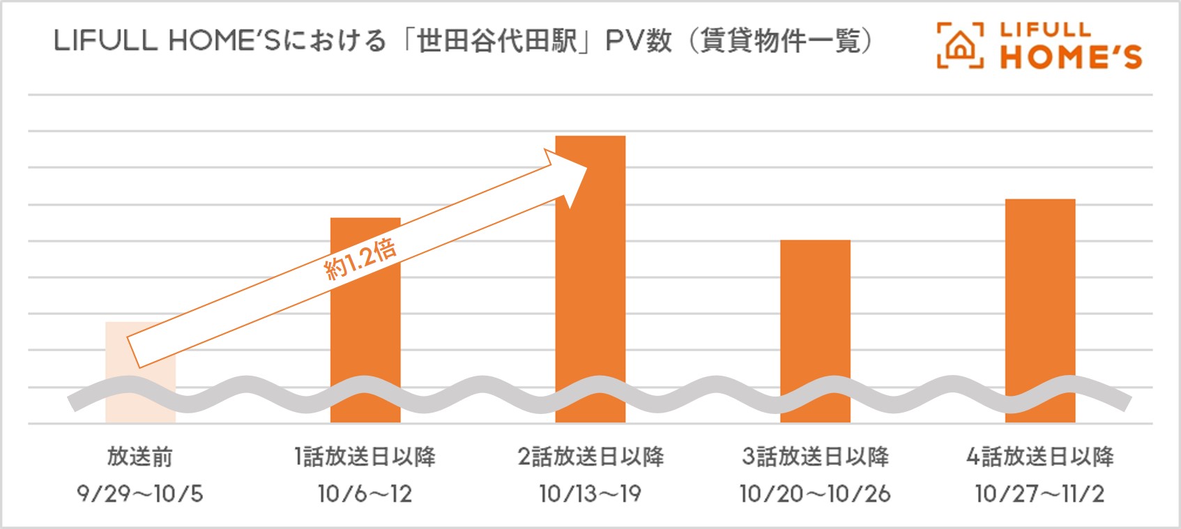 放送前1週間(9月29日~10月5日)と放送後のLIFULL HOME'S内における『世田谷代田駅』の賃貸物件一覧ページのPV数を比べたところ、駅のホームや改札付近が登場する1話放送日以降から検索数の増加が見られ、2話放送日以降の1週間(10月13日~19日)では放映前週の118%となりました。その後も全ての週で放送直前週を上回っており、ドラマの話題化とともにその舞台である『世田谷代田駅』にも注目が集まっていることがうかがえます。