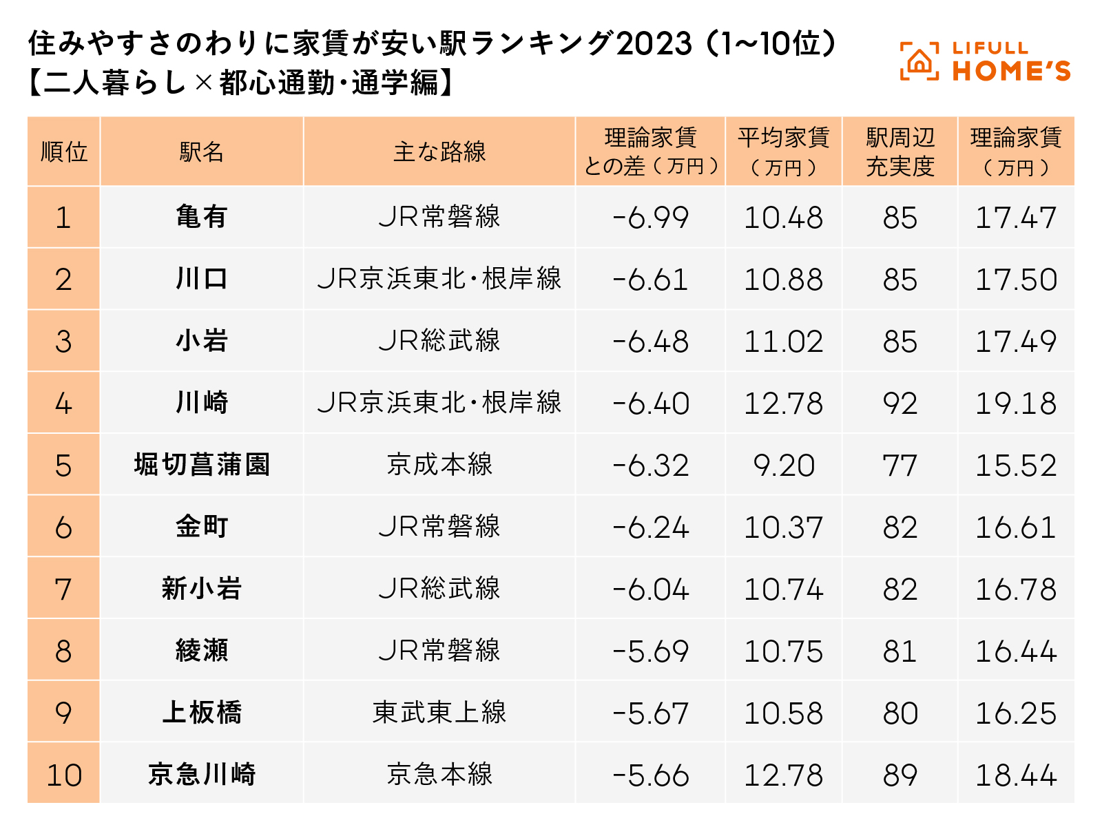 この春、結婚・同棲する二人に向けて 【二人暮らし×都心通勤編】住みやすさのわりに家賃が安い駅ランキング2023 LIFULL HOME'S PRESSが発表