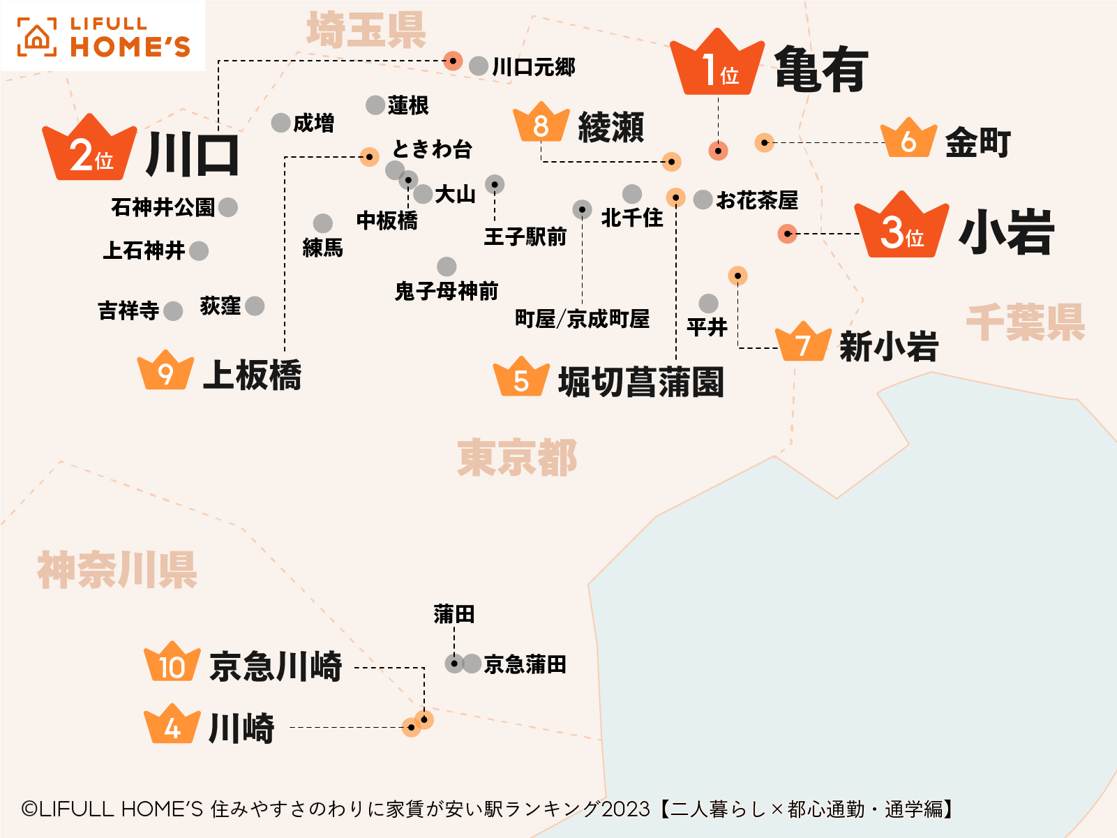 ランキングの1位は亀有駅(JR常磐線・東京都葛飾区)、2位は川口駅(JR京浜東北線・埼玉県川口市)と、1・2位は一人暮らし×都心通勤・通学編(※3)と同様の2駅がランクインしました。また、一人暮らし・都心通勤・通学編では8位だった小岩駅(JR総武線・東京都江戸川区)が3位に食い込んでいます。