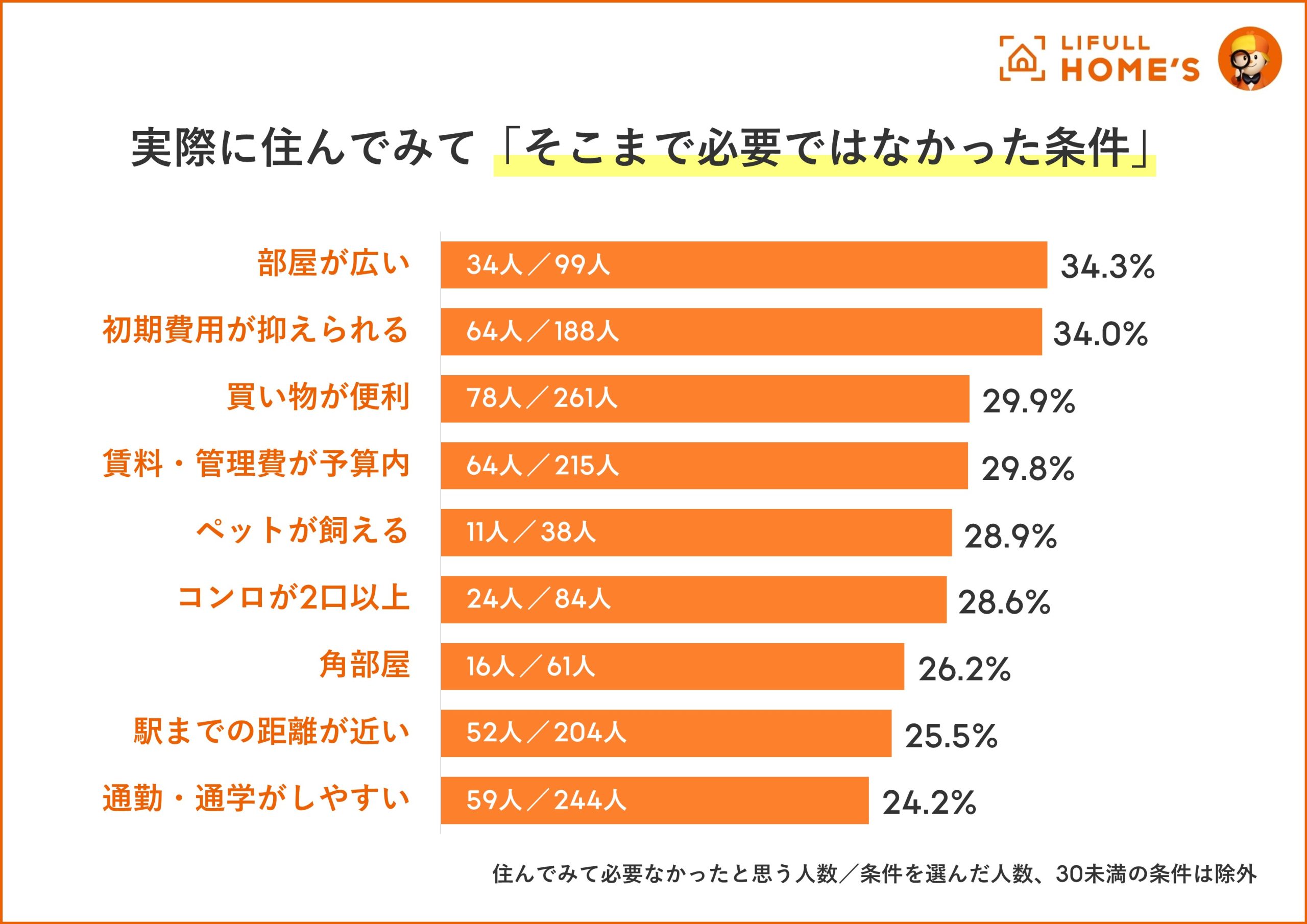実際に選んだ物件にあてはまる条件のうち、暮らしてみて「そこまで必要ではなかった」と感じる条件を挙げてもらいました。割合がもっとも高かった「部屋が広い」は、一人暮らしならではの条件というのが推測できます。必要以上の広さがあっても、掃除の手間や光熱費がかかってくることに繋がります。また、「コンロが2口以上ある」が上位にきているのも、実際は料理をさほどしなかったことの表れと言えます。
