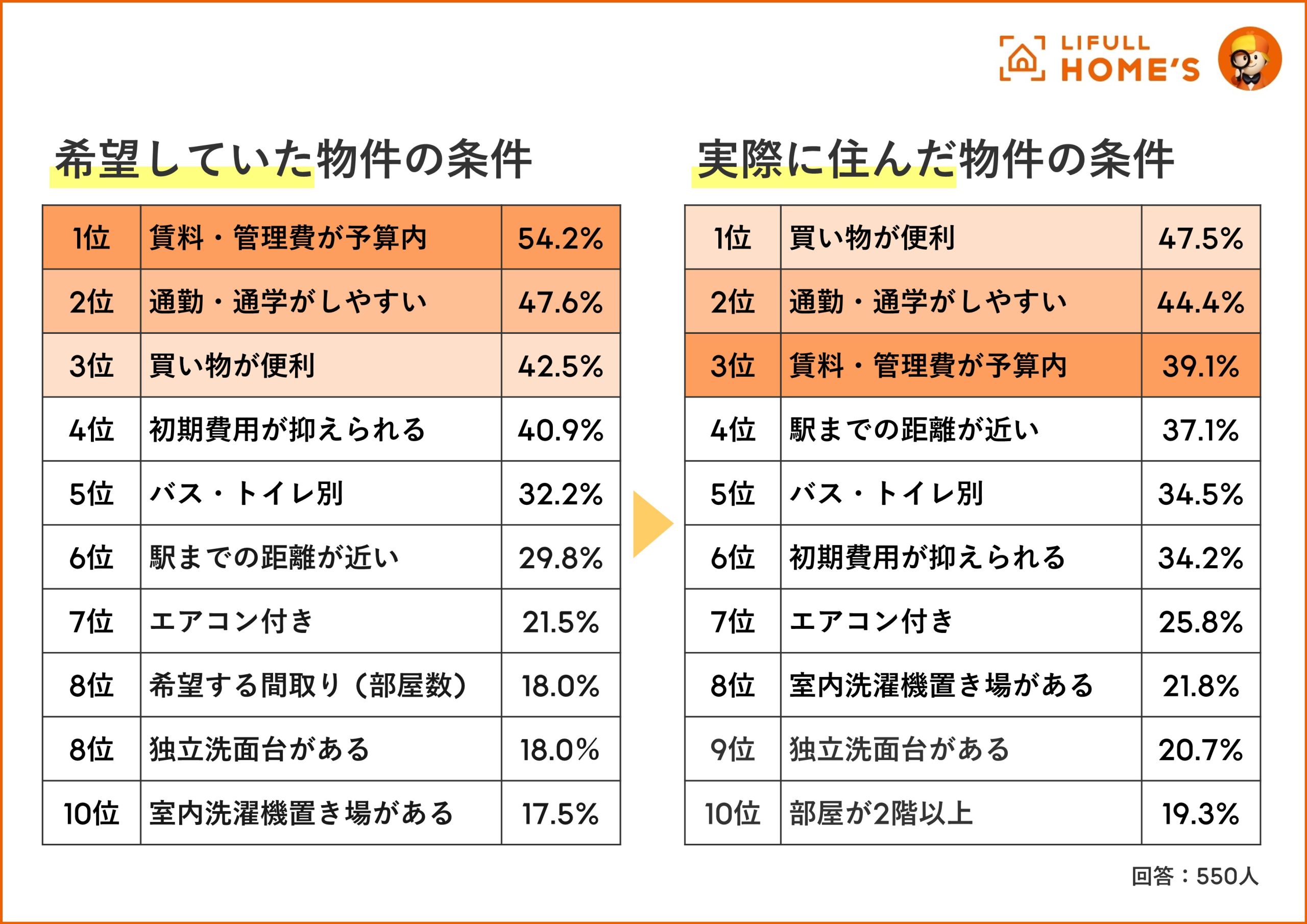 はじめての一人暮らしをするのに、「最初に希望していた条件」と「実際に住んだ物件の条件」を550人に聞いて、ランキング化しました。その結果、希望条件では、「賃料・管理費が予算内に収まる」という費用面をもっとも重視していたものの、実際に選んだ条件では「通勤・通学がしやすい」「買い物が便利である」という利便性がTOP2となりました。実際には約40%の人が希望をかなえられたという結果になります。また、8位の「希望する間取り(部屋数)」は、実際の選んだ条件からはランク外となっており、理想と現実のギャップが垣間見えます。
