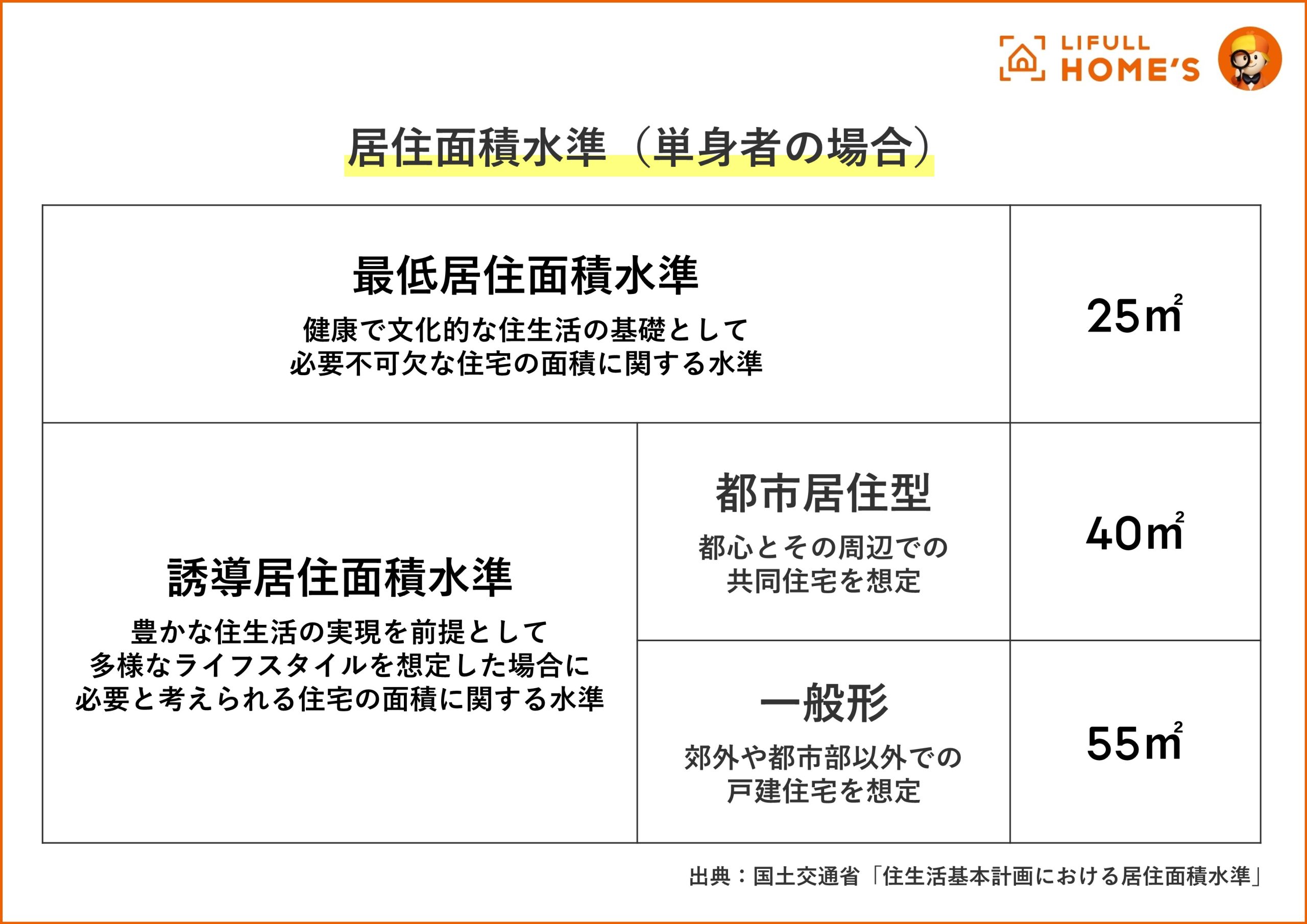 ひとり暮らしにおける部屋の広さの目安としたいのが国土交通省の居住面積水準です。最低限必要な面積(最低居住面積水準)と、ゆったり過ごせる広さ(誘導居住面積水準)が右のように示されています。友人などを頻繁に家に招くわけでなければ、誘導居住面積水準以上の平米数はなくてもいいでしょう。 ※国土交通省「住生活基本計画における居住面積水準」