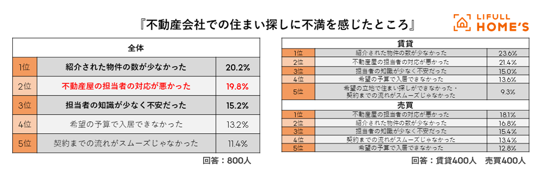 - 住まい探しに満足した人の理由、第1位は「不動産会社の担当者の対応が良かった」。一方、不満を感じた人は「紹介された物件の数が少なかった」が第1位に。