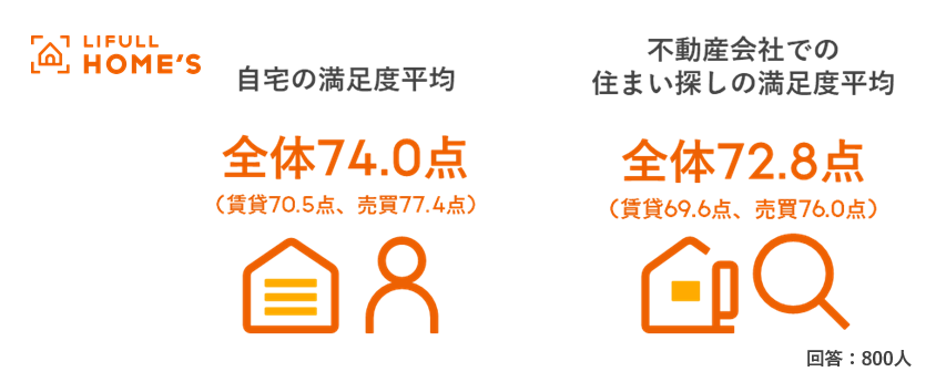 - 現在居住中の自宅の満足度は「平均74.0点」。不動産会社での住まい探しの満足度は「平均72.8点」。自宅の満足度が高い人でも、15%の人が住まい探しに不満を感じていた。