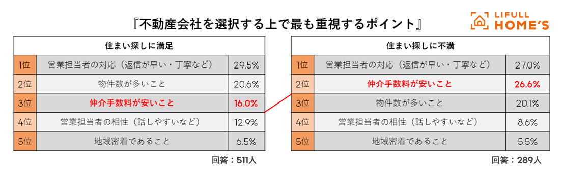 「仲介手数料の安さ」を重視すると、住まい探しに不満が残る傾向に。