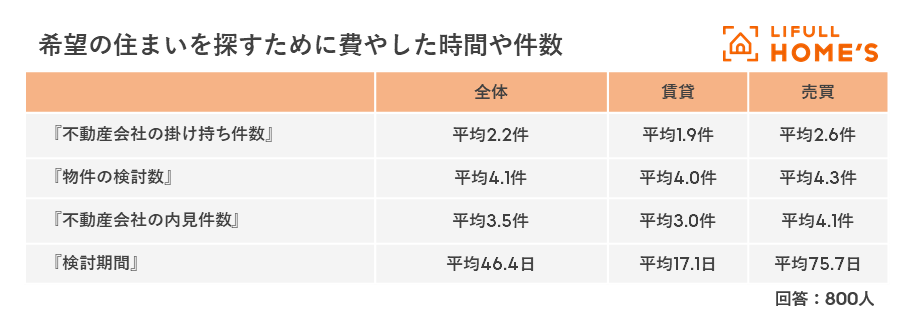 - 住まい探しでの不動産会社の掛け持ち件数は「平均2.2件」、物件の検討数は「平均4.1件」、物件の内見件数は「平均3.5件」。検討期間は「平均46.4日」、賃貸・売買で差があり、賃貸「平均17.1日」、売買「平均75.7日」。