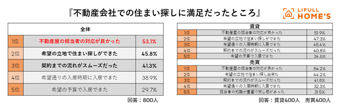 住まい探しに満足した人に『不動産会社での住まい探しに満足だったところ』を尋ねたところ、第1位「不動産会社の担当者の対応が良かった」が53.1%に。第2位「希望の立地で住まい探しできた(45.8%)」、第3位「契約までの流れがスムーズだった(41.3%)」が続きました。