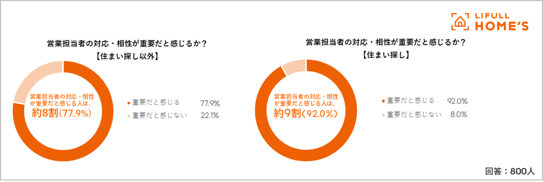 - 買い物の際、営業担当者の対応・相性が重要だと感じる人は約8割。住まい探しでは9割に。