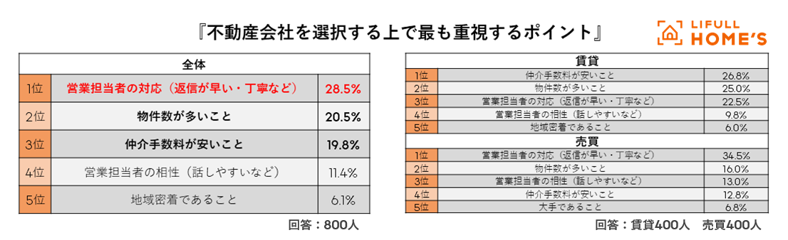 - 不動産会社を選択する上で最も重視するポイントTOP3は、「営業担当者の対応」「物件数の多さ」 「仲介手数料の安さ」。「仲介手数料の安さ」を重視すると、住まい探しに不満が残る傾向に。