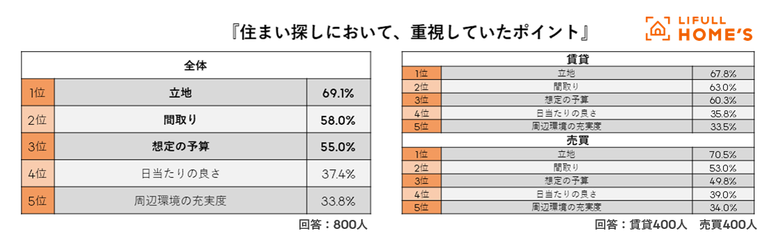 - 住まい探しで重視するポイントのTOP3は、「立地」「間取り」「想定の予算」。男女差を比べると、女性の方が住まい探しに求めるポイントが約1.2倍あることが判明。