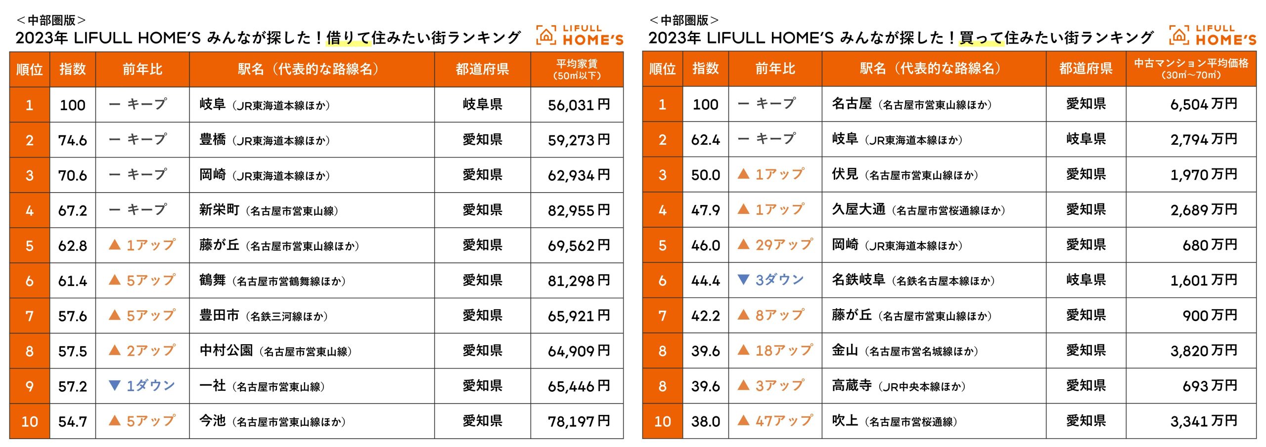 <中部圏版> 2023年 LIFULL HOME'S みんなが探した!住みたい街ランキング