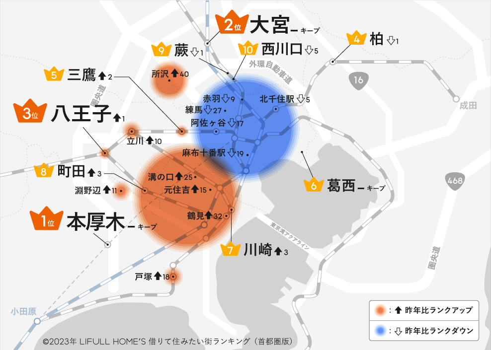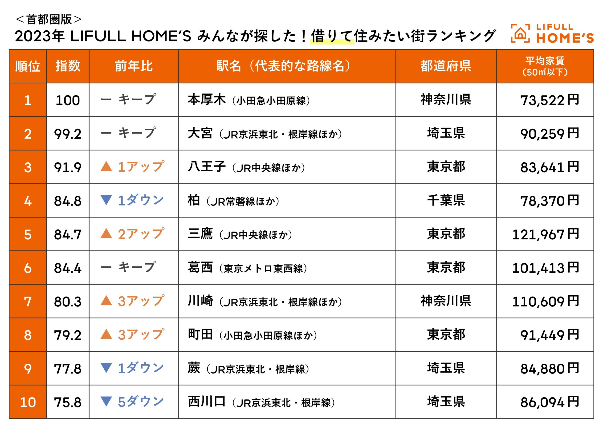 コロナ禍で順位を伸ばした神奈川県の「本厚木」が今回も1位を維持し、3年連続トップに輝きました。利便性やコストのバランスが取れた郊外エリアの人気は確立しており、「本厚木」の人気は本物といえます。TOP10には、「大宮(2位→2位)」や「八王子(4位→3位)」、「柏(3位→4位)」、「三鷹(7位→5位)」など、準近郊・郊外の駅で多くが占められており、昨年よりもさらに賃貸ニーズが郊外化していることが明らかです。