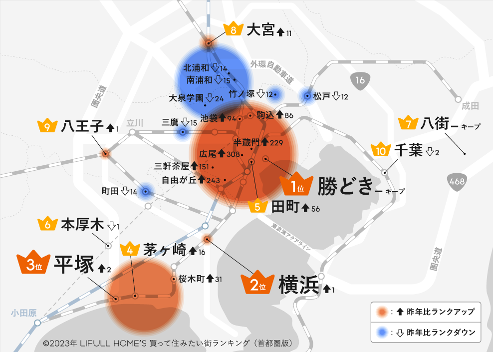 - 大規模な物件開発で「半蔵門」「麻布十番」など200位以上も順位を上げる駅が登場