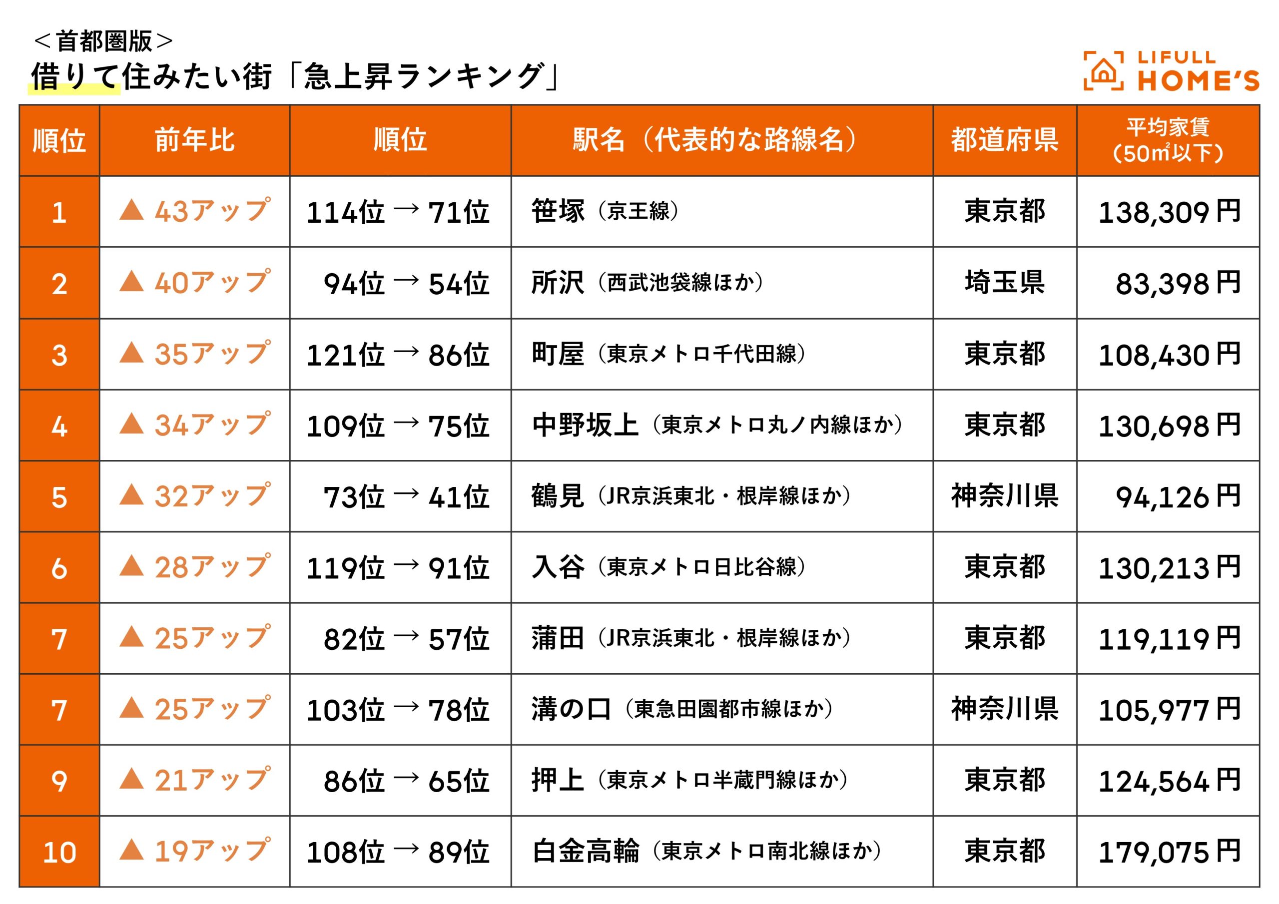 - 都心の人気も徐々に回復傾向。急上昇ランキング1位は43ランクアップした「笹塚」