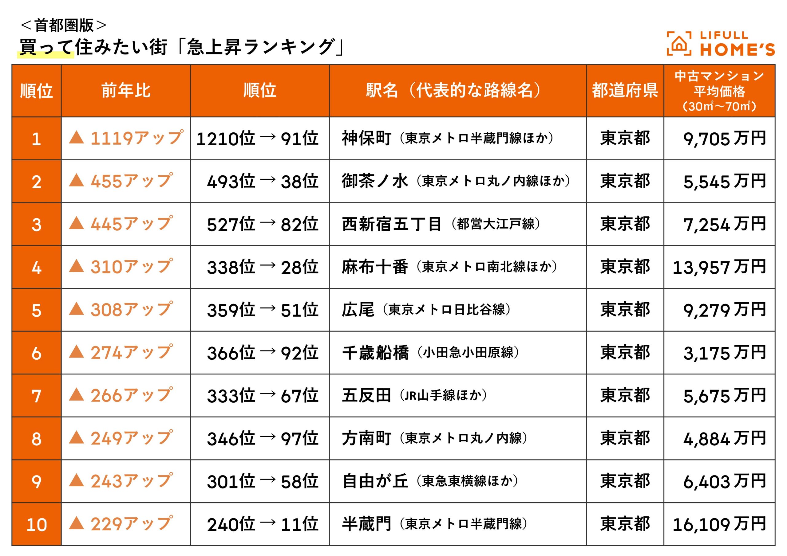 - 大規模な物件開発で「半蔵門」「麻布十番」など200位以上も順位を上げる駅が登場