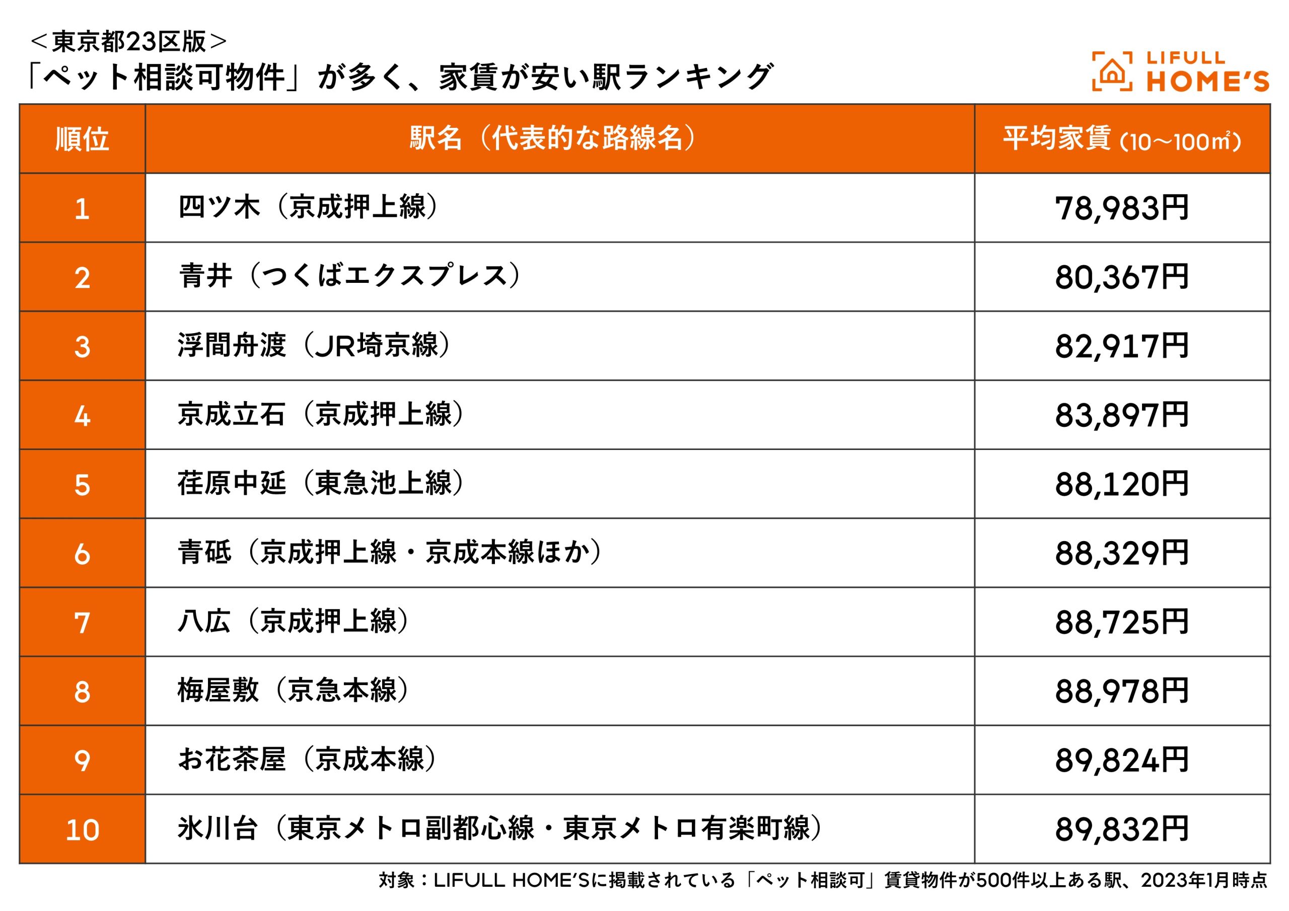 TOP10には京成押上線の駅が4駅ランクインしており、家賃を抑えてペットを飼いたい方は注目すべき路線といえます。