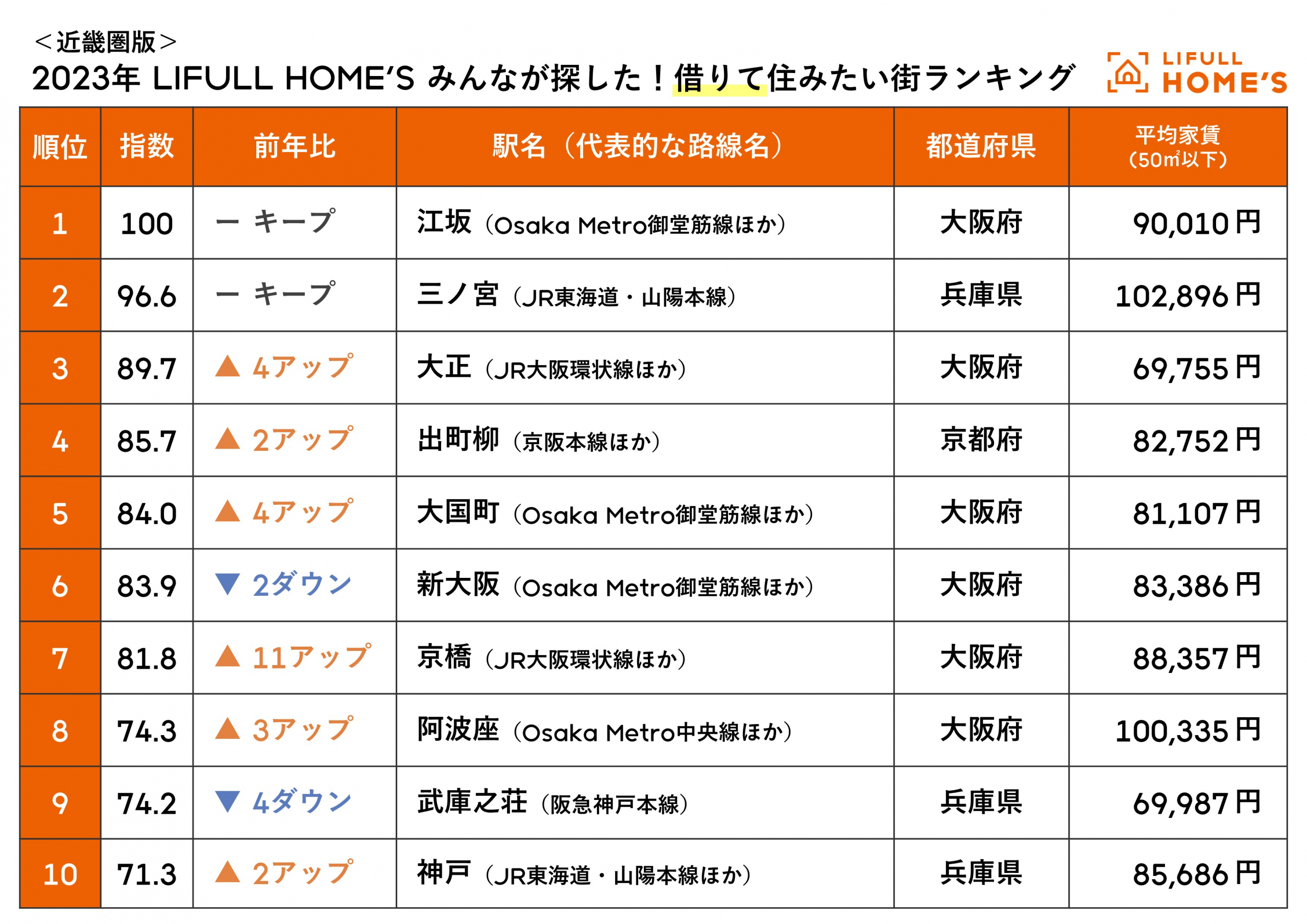・ 1位「江坂」2位「三ノ宮」が僅差でトップ争い「京橋」「阿波座」「神戸」がトップ10入り!