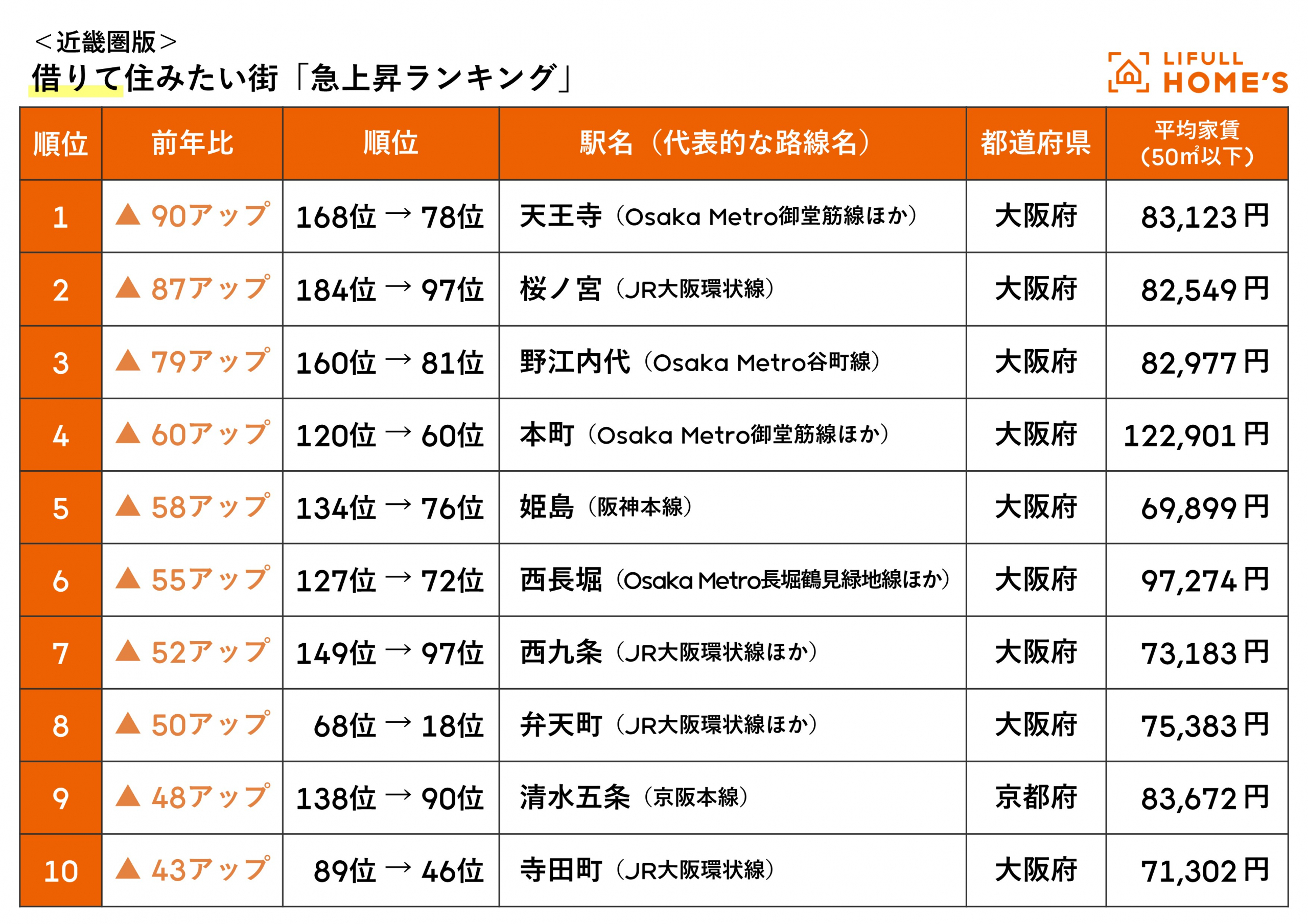 ・「急上昇ランキング」1位は「肥後橋」。大阪駅周辺へのアクセスの良さに注目が集まる!