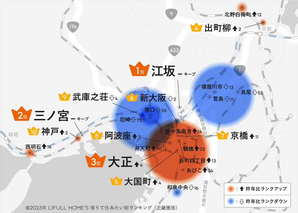 ■1位「江坂」2位「三ノ宮」が僅差でトップ争い 「京橋」「阿波座」「神戸」がトップ10入り!