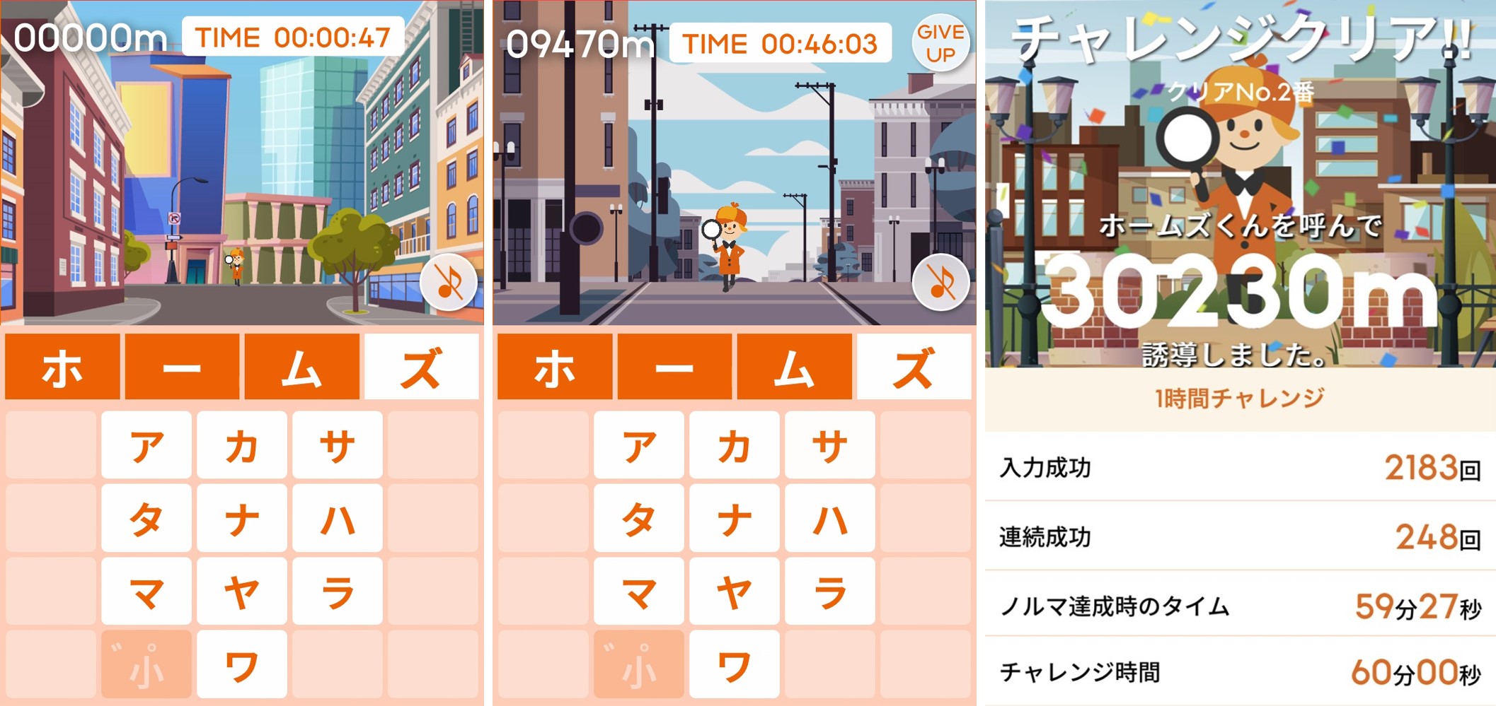 「ホームズ」1回の入力で10m進みます。10回連続入力成功で50mのボーナスが付与されます。